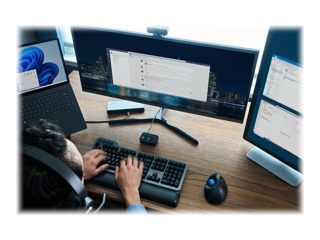 Les professionnels travaillant au bureau, à domicile ou en déplacement ont fréquemment besoin de passer d'une source audio à une autre depuis leur ordinateur portable, leur téléphone ou d'autres appareils. Qu'il s'agisse de répondre à un appel vidéo, de passer un appel téléphonique ou d'écouter de la musique, le basculement entre différents appareils peut être long et complexe. Notre switch audio 3 en 1 permet aux professionnels d'utiliser un même casque filaire ou sans fil tout en basculant entre trois sources audio différentes. Les utilisateurs peuvent facilement basculer entre leur ordinateur portable, leur téléphone ou leur tablette, ce qui leur permet d'augmenter leur productivité. Compatible avec de nombreuses plateformes, telles que Microsoft Teams, Google Meet, Zoom et WebEx, le switch audio 3 en 1 professionnel pour casques offre une expérience audio professionnelle grâce à ses boutons de commande pratiques permettant la commutation des appareils, le contrôle du volume et la désactivation du son.