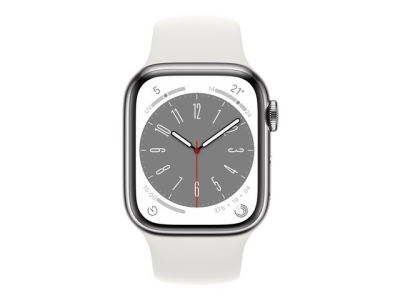 Apple Watch Series 8 (GPS + Cellular) - 41 mm - acier inoxydable argent - montre intelligente avec bande sport - fluoroélastomère - blanc - taille du bracelet : Normal - 32 Go - Wi-Fi, LTE, Bluetooth, UWB - 4G - 42.3 g