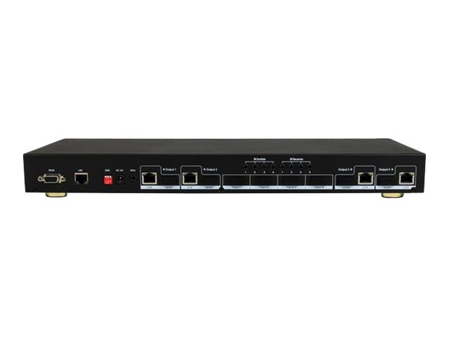 Le commutateur de matrice HDMI et extendeur de Cat5 ST424HDBT propose une solution complète d'affichage numérique qui vous permet de prolonger jusqu'à 70,1 mètres quatre sources audio/vidéo HDMI distinctes vers quatre affichages distants par le biais de récepteurs STHDBTRX (vendus séparément). La commutation de matrice permet à chacun des affichages distants d'envoyer des signaux vidéo et de passer d'une source à l'autre.